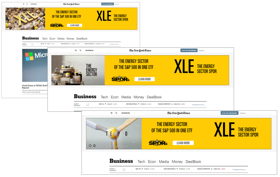 Select Sector SPDRs just completed a new set of creative assets to promote each of their 11 sector ETF funds. The general media strategy for the campaign is to leverage contextual targeting capabilities on financial sites. So for example, an article about materials stocks would show the XLB (The Materials Sector) creative. Along with contextual targeting, they also wanted to incorporate a top-funnel component to the campaign in order to raise awareness for the brand overall. We needed to marry the sector-specific creative that was developed for contextual targeting with a high impact site-takeover execution.
